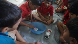 The first experiment was none other than the intriguing “Raising Volcano.” The teachers and kids together combined baking soda and added food cooler in a plastic cup. The kids were allowed to stir the mixture well before adding the last ingredient. Now was the moment of truth! They poured vinegar until it started foaming and soon, they saw lava pouring all over.