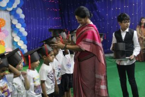Then came the moment everyone was waiting for – The Graduation Ceremony! Tiny toys wearing colourful dresses and caps walked onto the stage and our Principal, Mrs. Shamantha Nalla along with the grandparent of Pre-kids Mrs. Sathyavathi, felicitated the children with their graduation caps. The little ones could barely contain their joy and excitement. They expressed their gratitude towards their parents and teachers through a beautiful dance performance.
