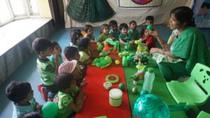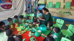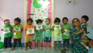 The Nursery students and teachers came to school in pretty green attires and resembled Eco-friendly. The classrooms and notice boards were beautifully decorated in green theme with flashcards, balloons & green objects. The students were taught the identification and recognition of green fruits, vegetables, leaves, trees etc. Children brought green snacks and vegetables in their lunch box.
