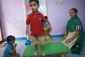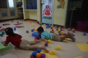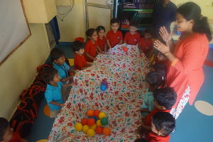 We filled the classroom with multiple, differently-coloured balls and the kids were given the task of collecting as many balls as they could as they crawled through the classroom. The kid who was able to collect the maximum number of balls in his/her basket won.