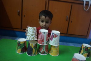 Using disposable glasses, our kids made pyramids! It was tough initially because they needed to learn how to balance the glasses, but they did it very well in the end and were proud of their pyramids.