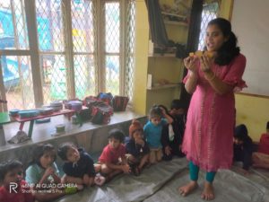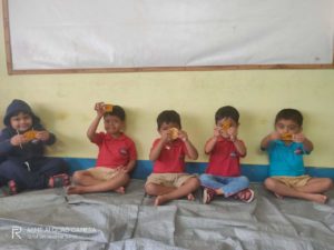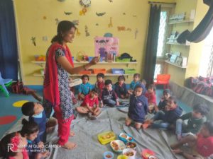 The Shapes with Food activity started with a brief introduction about food and shapes. The teachers later took examples of food such as fruits, biscuits, and idly to explain that each of them has a definite shape. Children were gazing and listening to their teacher the entire time intently, enthralled by the activity.