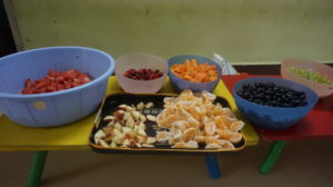 After all this, they got together for activities such as cutting fruits into beautiful kebabs and placing them on skewers carefully. Each skewer had colourful fruits that made it look like a rainbow! Every single child had a lot of fun and was thoroughly entertained.