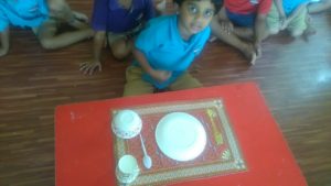We have conducted the activity on 16th Oct, where kids learned how to set a table. “I learned how to spread the mat and also the position of different things like plate, spoon, knife, fork, bowl and glass”, one of the kid expressed. “Kids listened to the class interestingly and learnt how to arrange a dining table when relatives come home”, a teacher from PPII said.